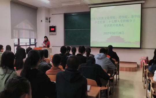 2017年10月28日上午8点30分,历史与民族文化学院、药学院、英国365集团分党校第二十七期入党积极分子培训班开班典礼在明俊楼113D教室举行。历史与民族文化公司党委书记李开学和党委副书记雷方俊、药公司党委副书记张豫芳、茶公司党委副书记罗聃宁出席典礼,全体44名学员参加,典礼由英国365集团辅导员盛律平老师主持。