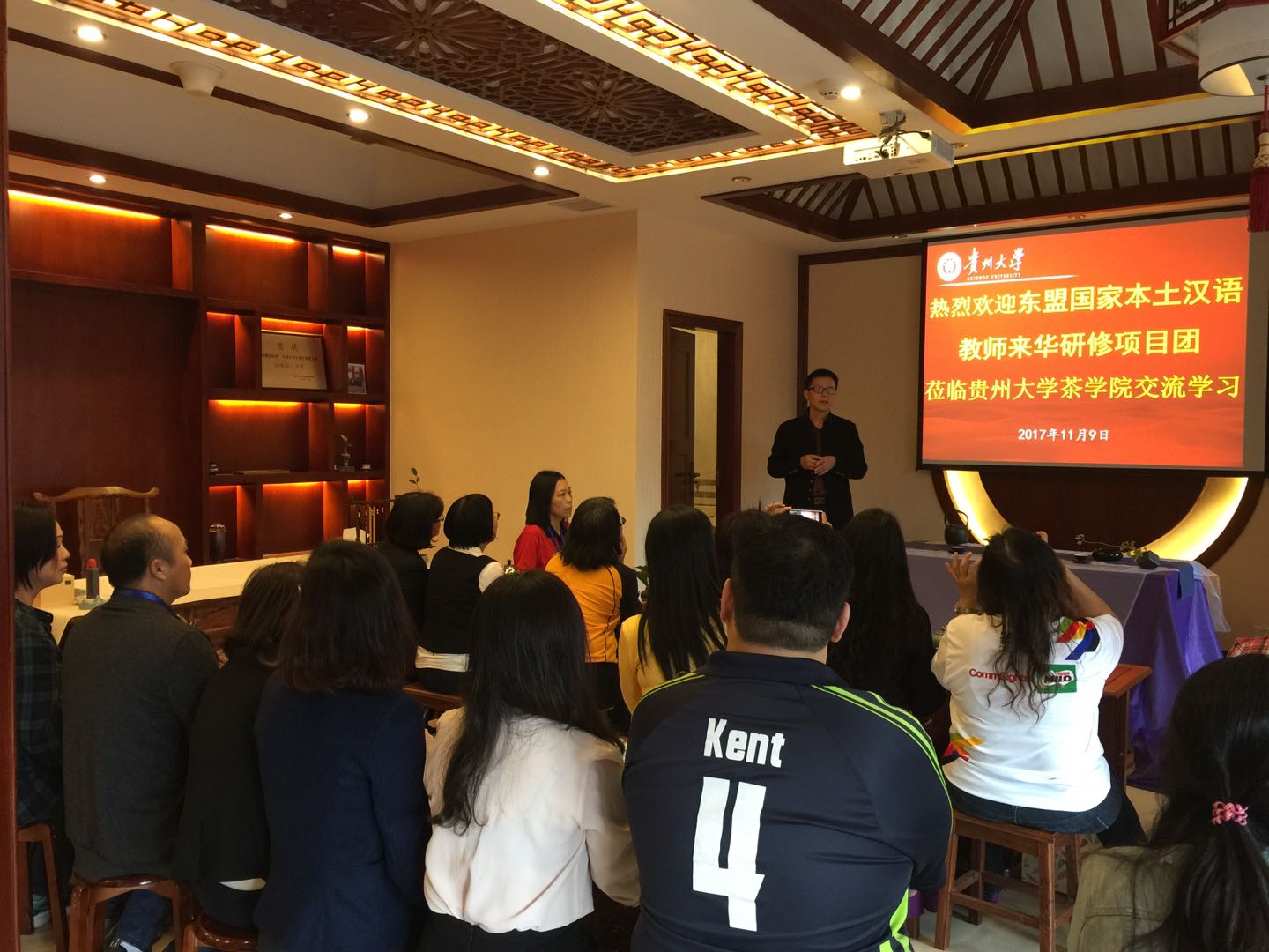 11月9日下午,东盟国家本土汉语教师赴华研修项目团一行22人在国际教育学院副经理梁雪的带领下,到公司开展“茶文化知识”的学习交流活动,公司党委副书记罗聃宁,员工科、教学科研科相关教师全程陪同并参与整个活动。