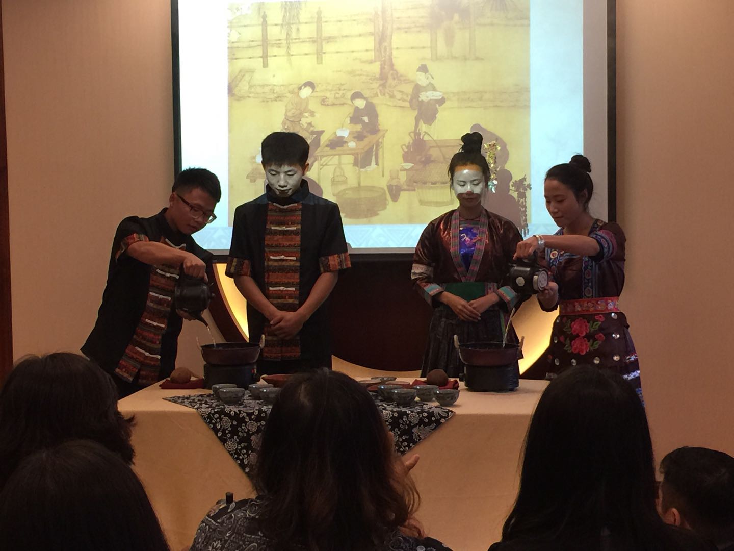 活动中公司2014级姜睿同学的青茶茶艺表演《雨巷》将现场的各位嘉宾领入了一个梅雨季节阴沉的江南小巷;2015、2016级同学的“侗族打油茶”茶艺表演则带领大家进入到充满民族风情、热情好客的贵州侗乡。两个不同风格的茶艺表演让现场的各位嘉宾深深地感受到中国茶文化的博大精深、民族文化的绚丽多彩。