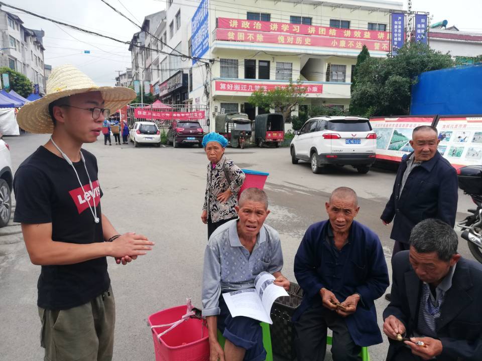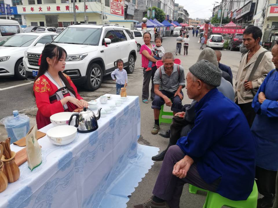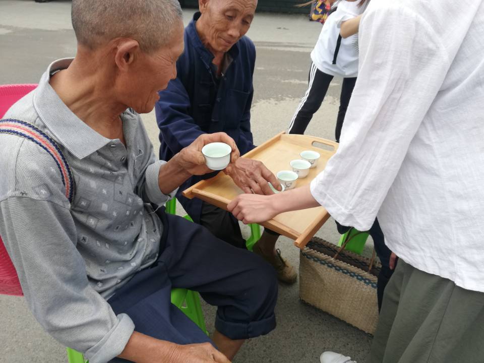 围观群众绕台而坐,一边品茶一边颔首,有的对手中茶杯赞叹不已,有的惊叹于茶之香纯。实践队员一边敬茶,一边给群众讲解茶文化知识,传播茶道精神,教他们如何泡一杯好茶,让他们受到茶文化的洗礼,使他们爱茶、懂茶、赏茶,从而增强他们种茶的意识和信心。