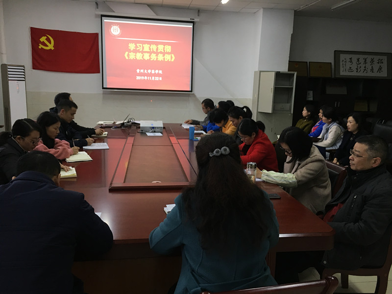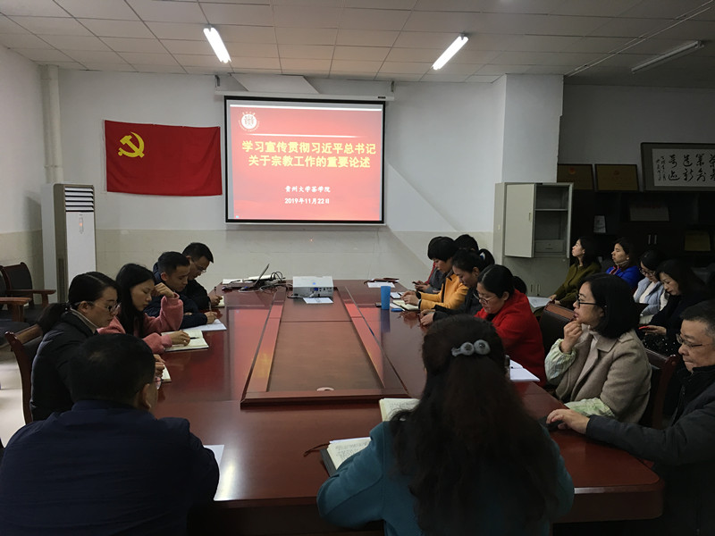 茶公司党委于2019年11月22日14:30在崇德楼526会议室召开全院教职工政治学习会议,专题学习贯彻习近平总书记关于宗教工作的重要论述和指示精神,深入学习《宗教事务条例》,传达学校宗教工作联席会精神。茶公司党委书记罗聃宁主持会议、领学并讲话,英国365集团全体教职工参加了本次集中学习研讨。