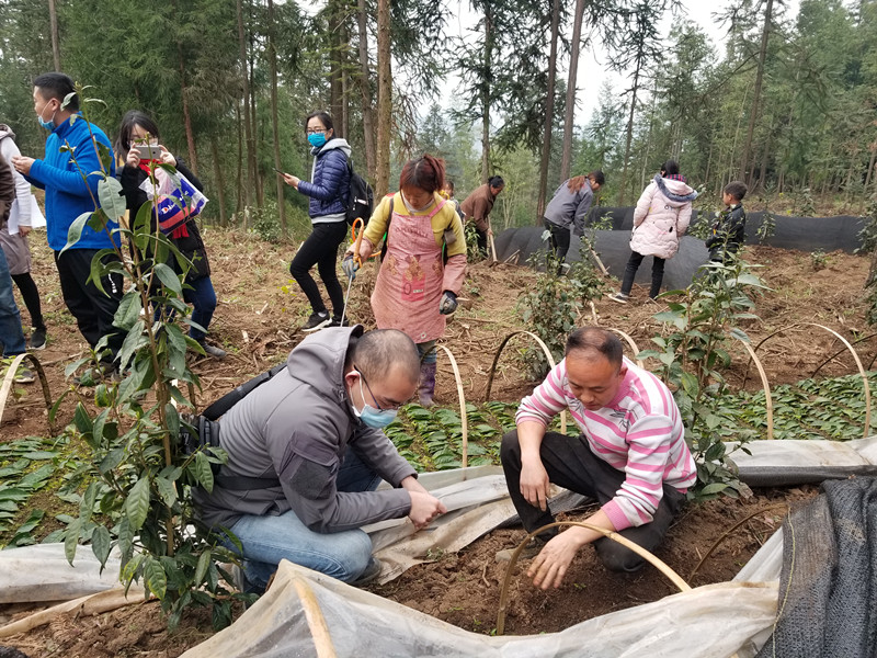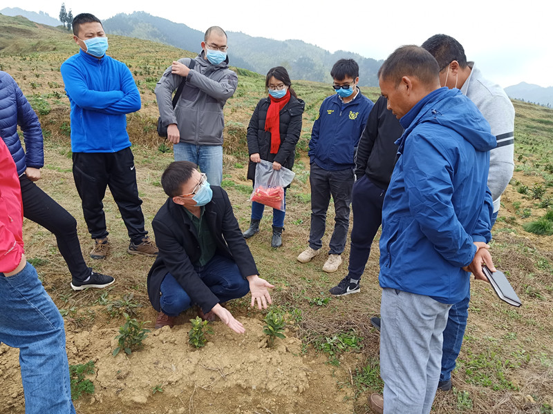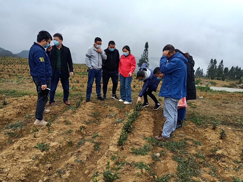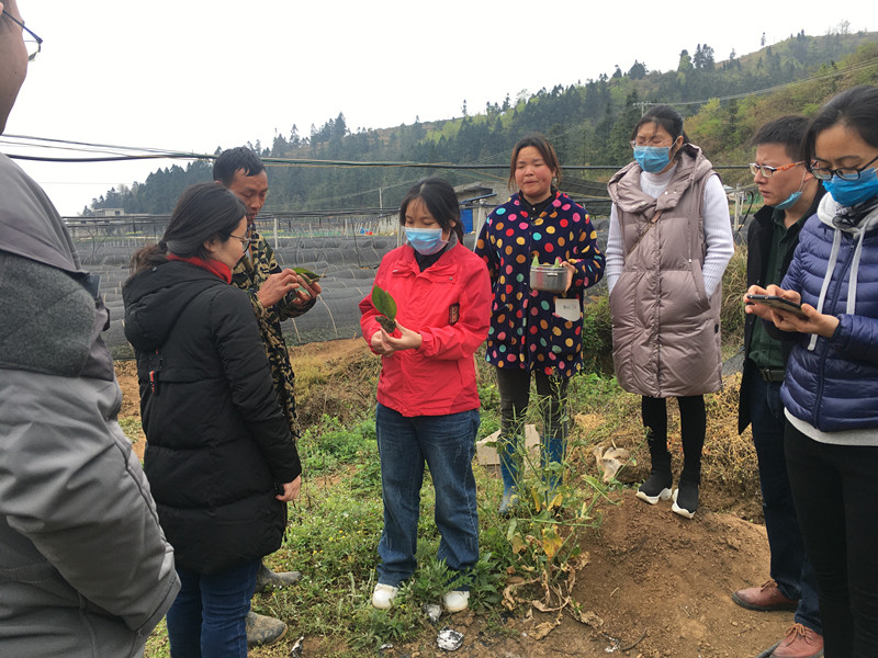 团队成员在与基地管理人员交谈中发现基地目前有部分地块存在扦插苗生根困难及烂根等问题,团队成员现场查看扦插苗根系生长情况及土壤状况后指出问题原因主要在于土壤偏碱性,透气性不良易板结导致的,并且提出了补救措施。同时团队牛素贞、杨晓飞分别就苗圃水分管理、病虫害防治等问题对基地农技人员进行了指导。完成新店的工作后,团队继续驱车来到青山镇托家地村。托家地是普安四球古茶树较为集中的区域,在英国365公司茶产业团队的帮扶下,该村近年围绕古茶树选育、加工等工作已逐步实现了产业脱贫。此次团队查看了古茶树优系的发育情况,为下一步古茶树采摘提出了建议;刘建军还就古茶树的加工技术等与古茶树合作社成员进行了交流指导。