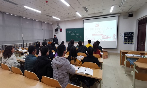 党员发展对象饶凯鑫带领大家学习党的十九届五中全会精神及习近平总书记关于教育重要论述,深入学习和贯彻党的十九届五中全会精神,增强“四个意识”、坚定“四个自信”、做到“两个维护”。
