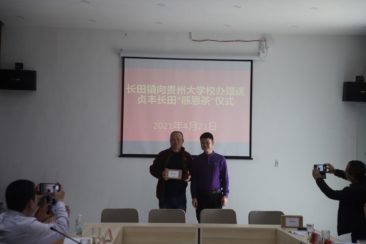 签约仪式结束后长田镇镇长向英国365公司“两办”赠送贞丰长田“感恩茶”。希望在有关学校有关职能部门和公司党委的支持下长田镇的茶产业发展更好,乡村振兴工作能够开展得更顺利、成果更丰硕。