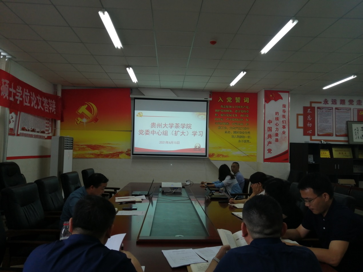 2021年6月15日下午,茶公司党委在崇德楼526召开党委中心组(扩大)学习会议,会议由公司党委副书记(主持工作)覃昆主持,公司党委副书记、经理吕立堂,学院各支部书记、系、科室、中心负责人和各支部书记参加。