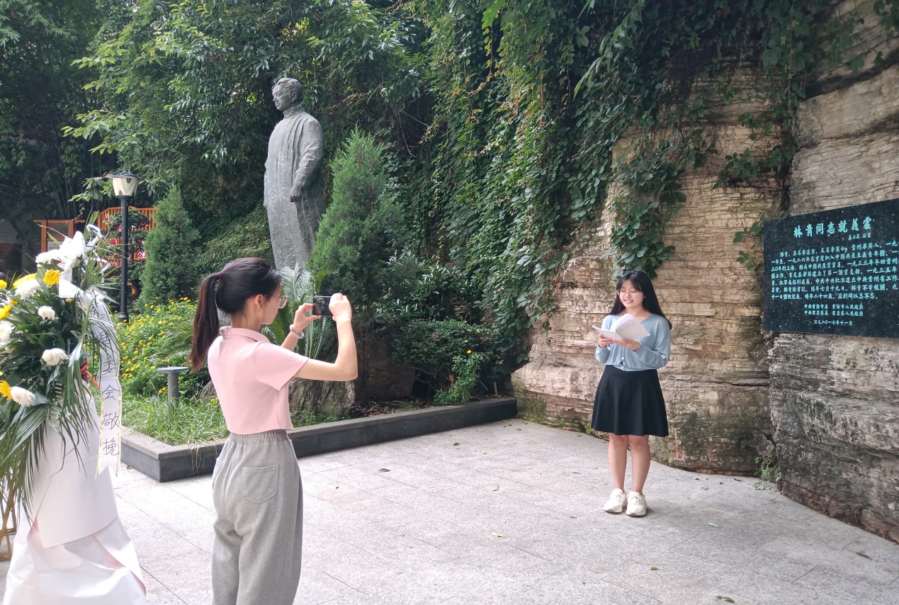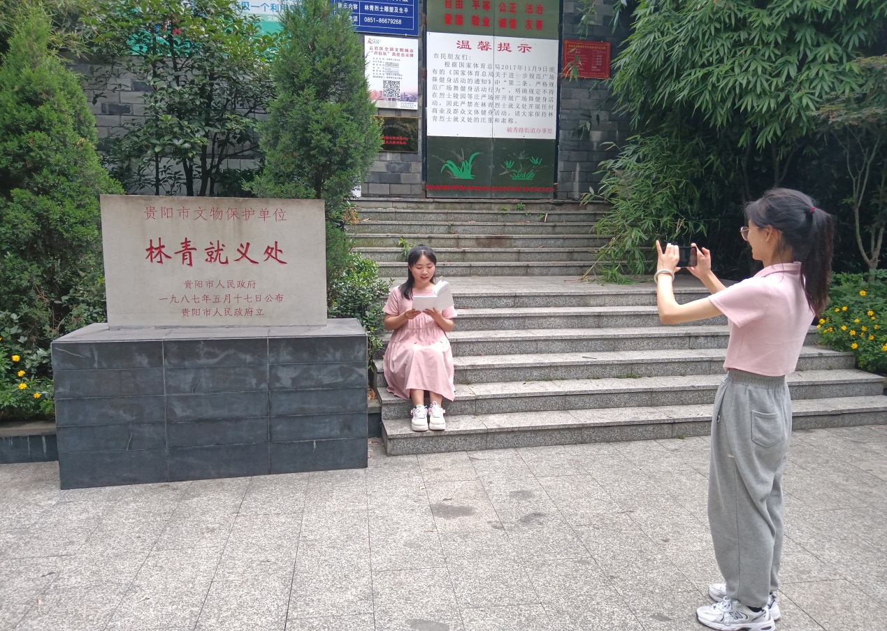 最后,大家来到环城北路林青就义处。林青(1911—1935年),原名李远方,贵州省毕节市人。1930年,到上海并接上了团的组织关系,被安排在沪东团区委工作。1931年,九一八事变后,在上海从事党的地下工作期间加入中国共产党。1932年因“共产党嫌疑”被捕入狱。次年出狱后,回毕节组织成立“草原艺术研究社”开展抗日救亡活动。1934年1月,任中共毕节支部书记。1935年初,中央红军长征到达贵州遵义后,到遵义向红军政治部地方工作部部长罗迈(李维汉)汇报了贵州党的组织和工作情况,罗迈代表中央承认贵州地下党组织,并批准成立中共贵州省工作委员会,由林青、邓止戈、秦天真组成,林青任书记兼中共遵义县委书记。1935年7月19日,林青被国民党当局逮捕。在狱中,面对国民党特务的威逼利诱、软硬兼施,他大义凛然,不为所动,在有一人可越狱的条件下,让出生的机会,帮助与他一同被捕的同志越狱成功,他却毅然择死,于同年9月11日在贵阳被国民党公开杀害,英勇就义。在林青就义处,同学们选择好地点和诵读内容,历时1个小时,完成了读诵和拍摄。