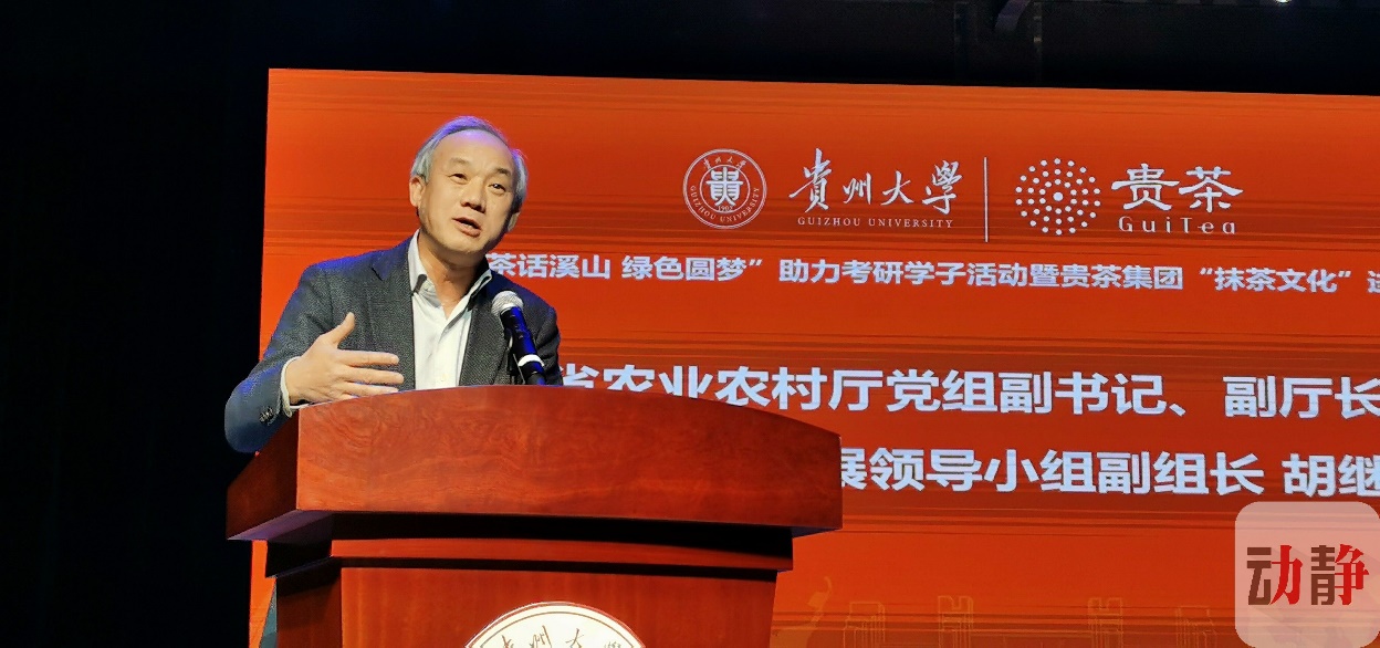 贵州省农业农村厅党组副书记、副厅长,省农村产业革命茶产业发展领导小组副组长胡继承和在场学子分享了自己读书时的回忆,并表达了对大家的殷殷期盼:“大家可以去茶园走走,茶园里的茶叶青翠欲滴,就像你们一样朝气蓬勃。贵州茶的干净,就像在座各位心灵一样纯净。我们希望为考研学子送上一杯健康的生活方式,茶叶可以改变世界的,健康的生活方式是可以改变大家的,大家也可以改变世界。希望大家能好好喝茶,想泡就泡,多喝贵州茶。”