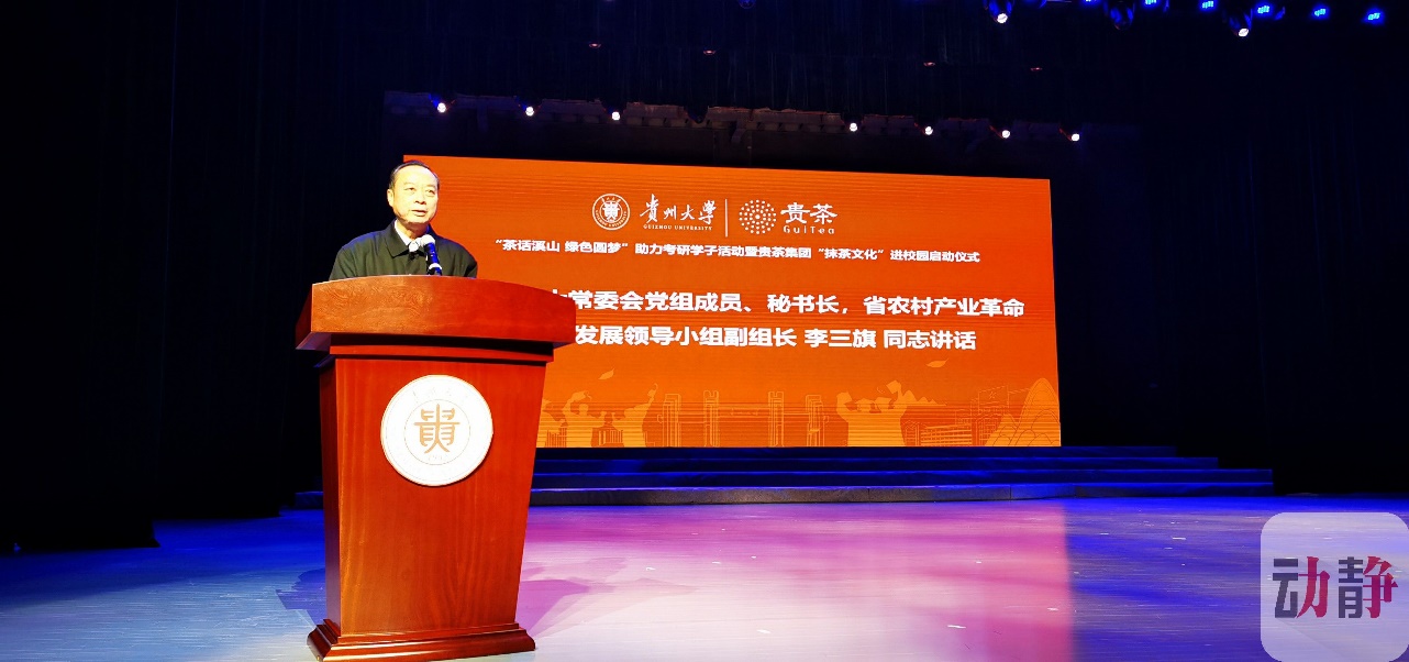 活动上,贵州省人大常委会党组成员、秘书长,省农村产业革命茶产业发展领导小组副组长李三旗在讲话中提到,“这次抹茶文化进校园是名校和名企的又一次合作,今天在座的各位同学,不管您今后从事什么专业,都要喝贵州茶、宣传贵州茶、支持贵州茶。贵州茶产业的未来书写者是你们,贵州茶文化的弘扬实践者是你们,贵州茶产业需要将你们的所学知识转化为生产力,将论文书写在多彩贵州的大地上,以年轻人满腔的热情与坚毅,写好茶文化、茶产业、茶科技这篇大文章,为贵州茶产业更加辉煌贡献力量。”