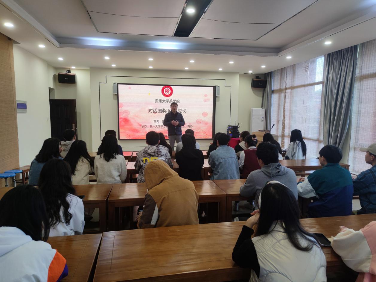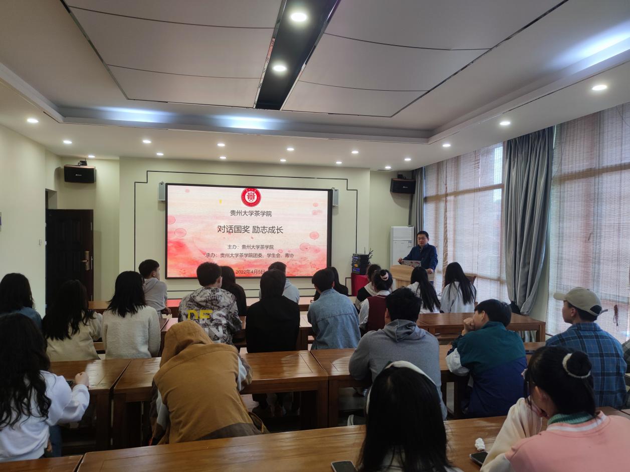 44日举行“对话国奖、励志成长”经验分享活动,活动由茶学182班国奖获得者杨洪志远同学进行在校期间学习生活分享。茶公司党委副书记(主持工作)覃昆、副经理刘建军、员工科辅导员王振、20级全体本科生参加分享会。