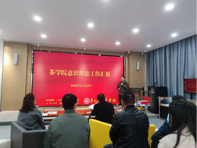 为进一步落实意识形态工作主体责任,由公司党委领导带队深入各基层党委,通过听取工作落实情况汇报、实地查阅资料等方式开展检查工作。在崇德楼一楼全省高校“三全育人”试点学院示范点暨“贵州绿茶”校园多功能展示体验区,覃昆代表茶公司党委汇报了2022年意识形态、统战工作执行及落实情况、主要成效、存在问题及下步工作打算等。