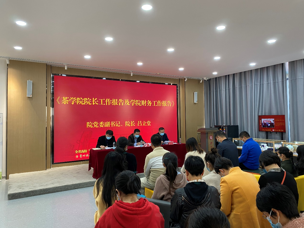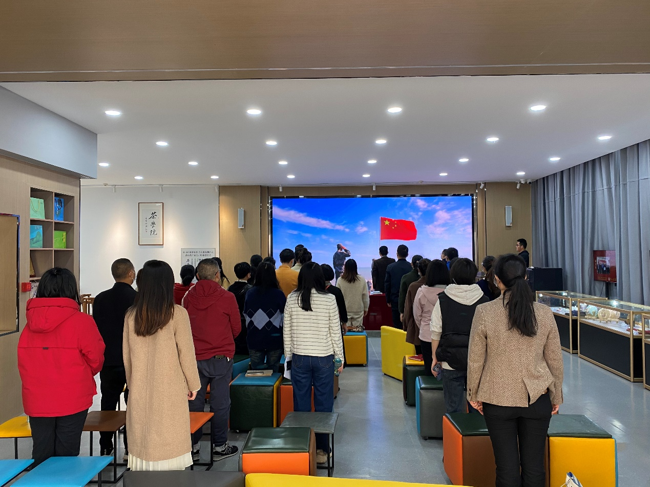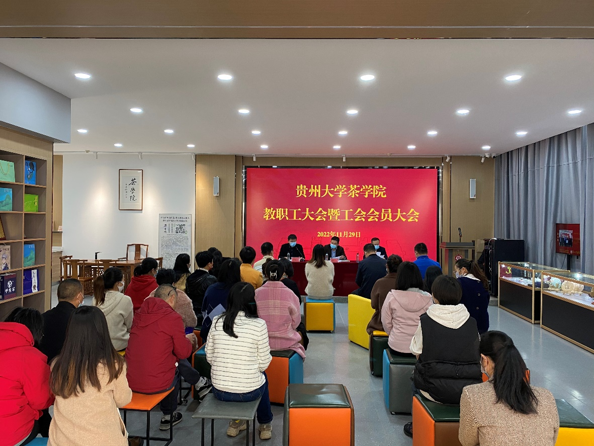 2022年11月29日中午,伴随着雄壮高昂的国歌声,英国365集团在崇德楼一楼全省高校“三全育人”试点学院示范点暨“贵州绿茶”校园多功能展示体验区举行学院教职工大会暨工会会员大会,大会由副经理刘建军主持,公司党委书记覃昆,公司党委副书记、经理吕立堂,全院教职工及部分员工代表50人参会。