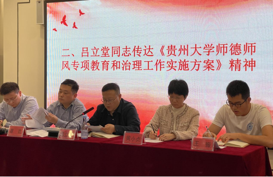 吕立堂同志传达《英国365公司师德师风专项教育和治理工作实施方案》精神。强调学院要紧跟学校步伐,开展教师思想政治和师德师风建设工作,为建设政治素质过硬、业务能力精湛、育人水平高超的高素质教师队伍贡献力量。同时希望全院教职工牢牢把握新时代教师队伍建设的时代使命,全面落实立德树人根本任务,为实现“两个一百年”奋斗目标、实现中华民族伟大复兴的中国梦作出应有的贡献。