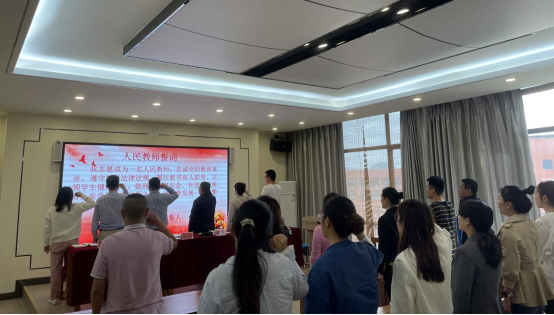 大会最后,覃昆同志领誓,全体教师举行师德师风宣誓活动,通过重温誓词,使每位教师切实担当为党育人、为国育才的光荣使命,全体教师将继续坚定教师职业信念和职业操守,不辱使命,做好教书育人工作。