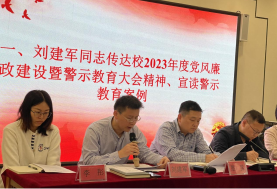刘建军同志传达校2023年度党风廉政建设暨警示教育大会精神、宣读警示教育案例。刘建军同志强调全院教职工要始终保持拒腐防变的警觉、为人师表的觉悟,从这些警示案例中汲取教训,举一反三、引以为戒,牢固树立底线意识,自觉遵守法律法规,严守纪律规矩,履职尽责,清白做人、干净做事,共同营造风清气正的教书育人环境。