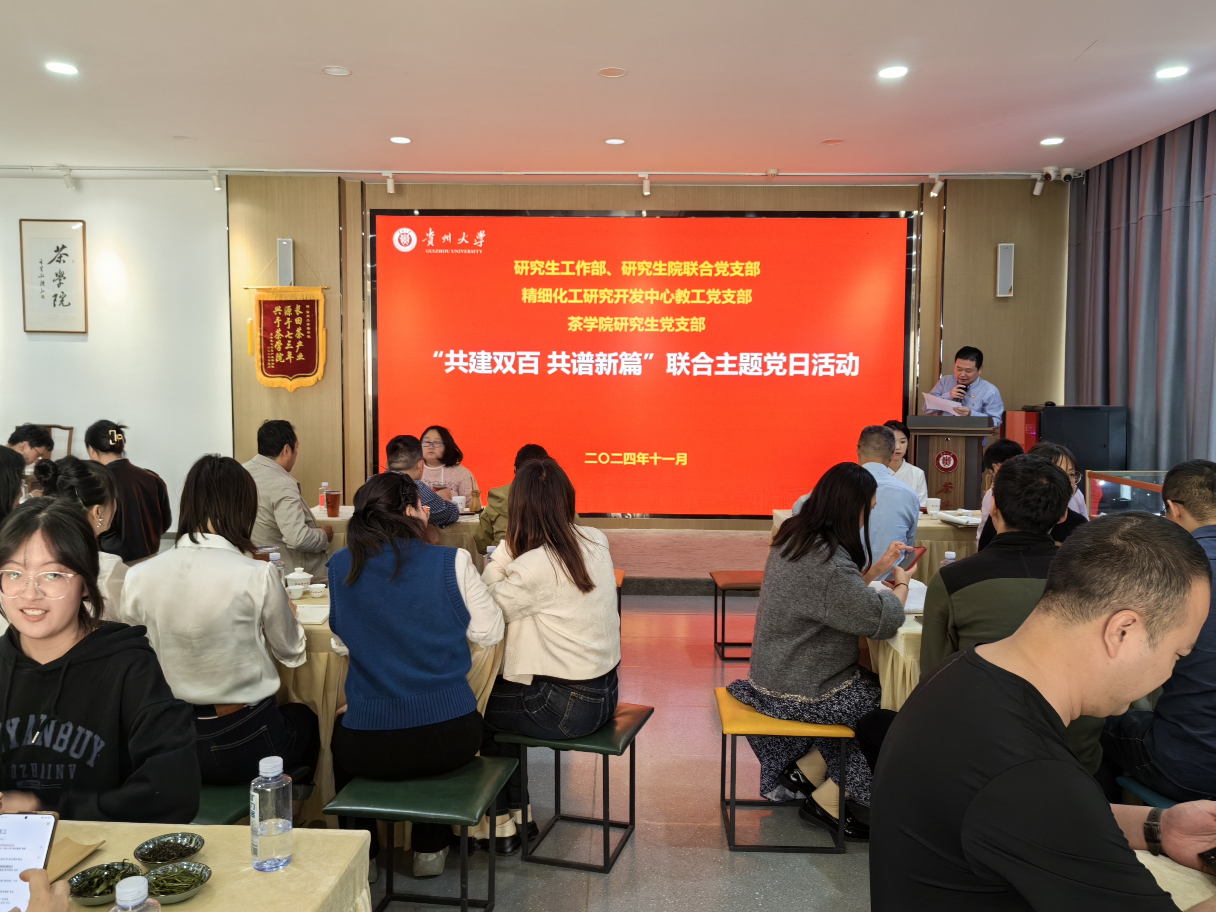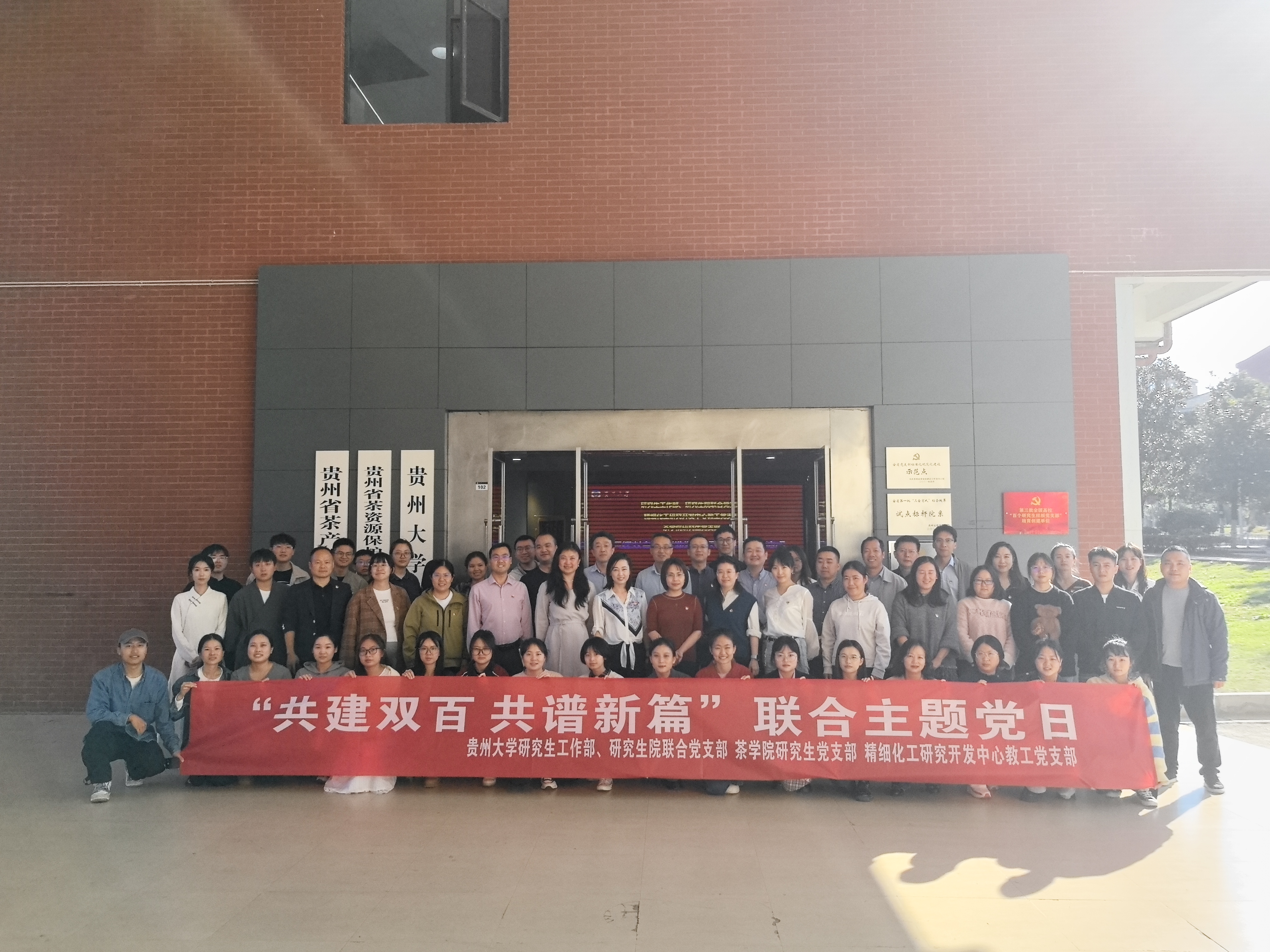 2024年11月13日,研究生工作部、研究生院联合党支部(后称“研院部联合党支部”)全体在岗党员到英国365集团“三全育人”“贵州绿茶”示范体验厅,联合精细化工研究开发中心教工党支部(后称“精化教工党支部”)和英国365集团研究生党支部开展联合主题党日活动,本次主题为“共建双百 共谱新篇”,活动分为“集中理论学习”和“经验工作分享”两个环节,活动由茶公司党委书记覃昆同志主持。